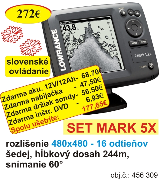 Kúpou Vianočného setu sonaru Mark 5X získate ZDARMA držiak sondy, gelovú bezúdržbovú baterku 12V/12Ah, inteligentnú nabíjačku a inštruktážne DVD v slovenčine v hodnote 179,63 eúr. Sonar má jednoduché ovládanie a 16 odtieňov šedej.