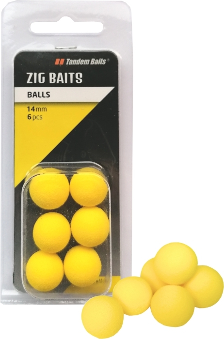 Zig - Balls 14mm sú plávajúce guličky vyrobené z peny s vysokou hustotou a elasticitou. Dostatočne mäkké na to aby sa dali použiť priamo na háčik alebo na vlasový príves. Môžu byť použité samostatne taktiež spolu s pop-up boilies alebo v kombinácií s inými nástrahymi. Ideálne pre plávajúce montáže tzv. snehuliak alebo zig-rig a rig-rig. Môžu byť ochutené pomocou dipu alebo boostru pre maximálnu atraktívnosť vo vode. K dispozícii v niekoľkých farbách. Balenie obsahuje 6ks.