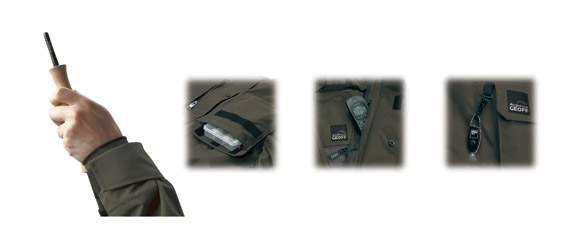 Na zápästiach bundy sú manžety, zabraňujúce vstupu vody . Nový dizajn vreciek je výsledok mnohoročných skúseností rybárov. Dve veľké a priestranné predné vrecká dávajú priestor pre rybárske krabičky , rybárske potreby na muškárenie a iné prívlačové drobnosti. Nepremokavé vnútorné vrecko spoľahlivo poslúži pre úschovu mobilného telefónu, peňaženky, dokladov. Veľké vrecko na chrbte poskytuje priestor pre veľké veci ako termo fľaša a podobne.