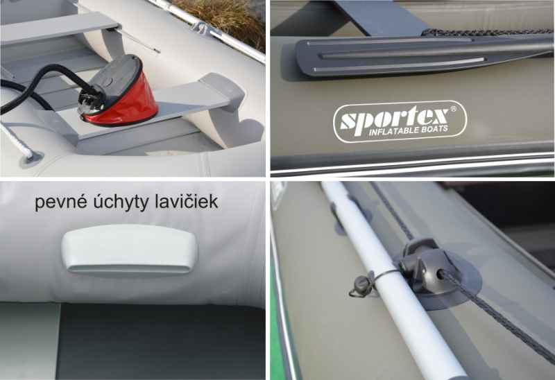 Všetky nafukovacie člny Sportex sú vyrobené z viacvrstvového materiálu syntetickej tkaniny (polyester) s obojstranným polyvinylchloridným pokrytím s vysokou odolnosťou voči oderu a mechanickému poškodeniu. Vlastnosti materiálu od SPORTEX (5 vrstvový PVC s prekladanými zváranými švami) zaručuje dlhú životnosť, vzduchotesnosť a ochranu pred vonkajšími vplyvmi, ako je teplo a chlad, UV žiarenie, slaná voda, olej a palivá. Plastifikačná prísada je materiál veľmi elastický, čo je obzvlášť užitočné v prípade skladania a rozkladania člna pri nízkych teplotách. Dostupné sú dve farebné prevedenia: zelená, alebo šedá.