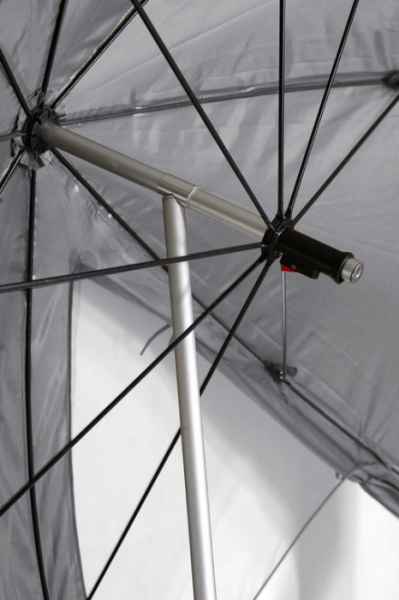 Sedieť dlho na slnku, na silnom vetre alebo v daždi nie je dobré. Vhodným riešením je praktický dáždnik, ktorý veľmi rýchlo rozložíme a môžeme sa venovať prípravám. V bežných podmienkach poskytuje takýto dáždnik spoľahlivú ochranu pred slnkom, dažďom, vetrom a padajúcou rosou.