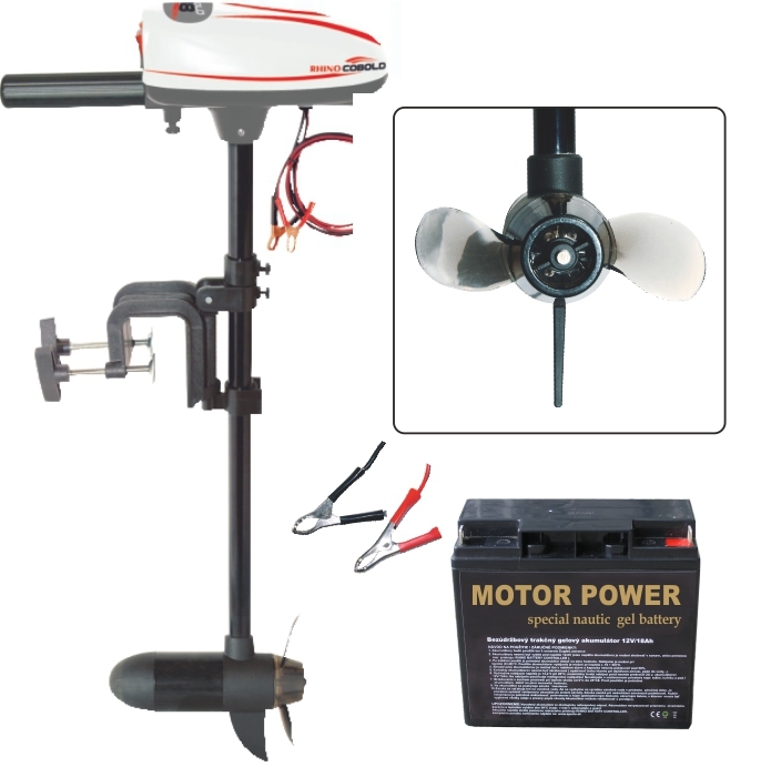 Lodný elektromotor Rhino Cobold (loď do 500kg) s dvomi rýchlosťami dopredu a dvomi dozadu + bezúdržbový akumulátor a nabíjačka. Je ideálny pre rybárov aj rekreantov.