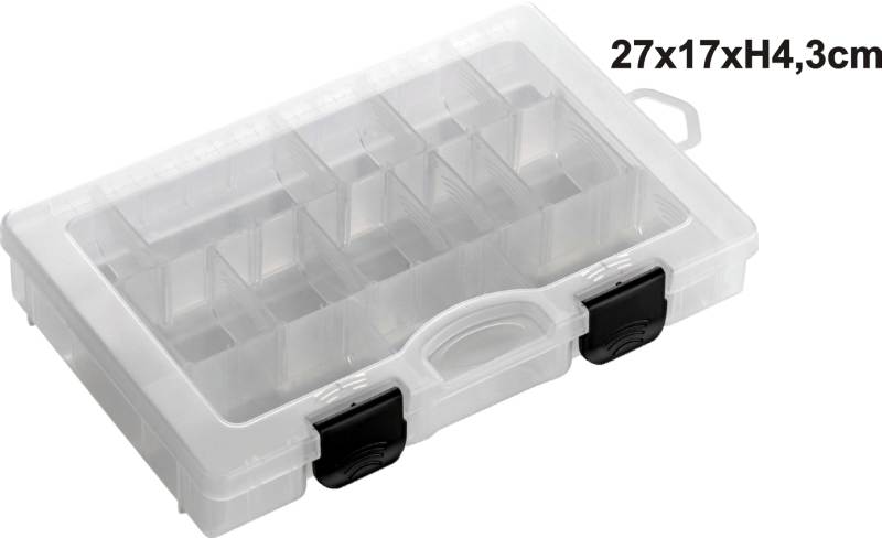 Plastová rybárska krabička s možnosťou nastavenia priečinkov podľa vlastných predstáv a potrieb. Zmestí sa do nej všetko potrebné, čo potrebujete mať vždy po ruke ako rybárska drobotina - háčiky, stopery, bužírky, plaváčiky, olová, nástrahy a iné.