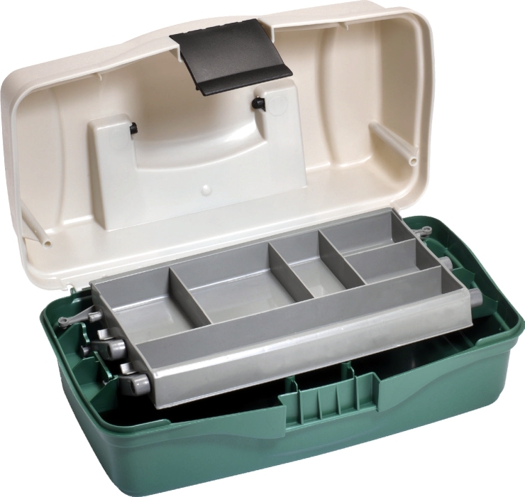 Rybársky kufor na prehľadné usporiadanie a transport rybárskeho príslušenstva a bižutérie. Kufor má väčší spodný preistor a jedno podlažie s priehradkami.