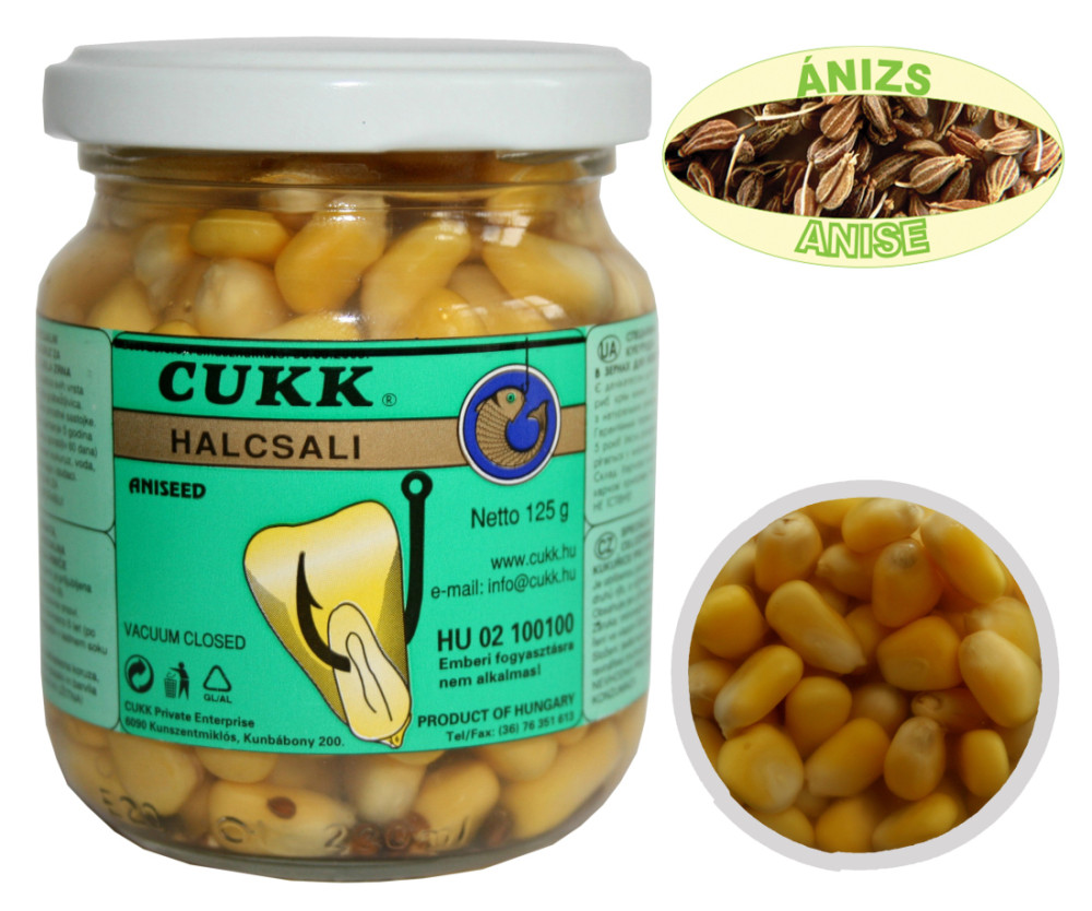 Lúpané a zavárané kukuričné zrná v náleve, príchuť Aníz,farba zelená, balenie 125g, univerzálna nástraha na lov kaprov a kaprovitých rýb a inej bielej ryby,nastražuje sa priamo na háčik,alebo , ako boilies, vhodná na feeder, plávanú a lov na ťažko.