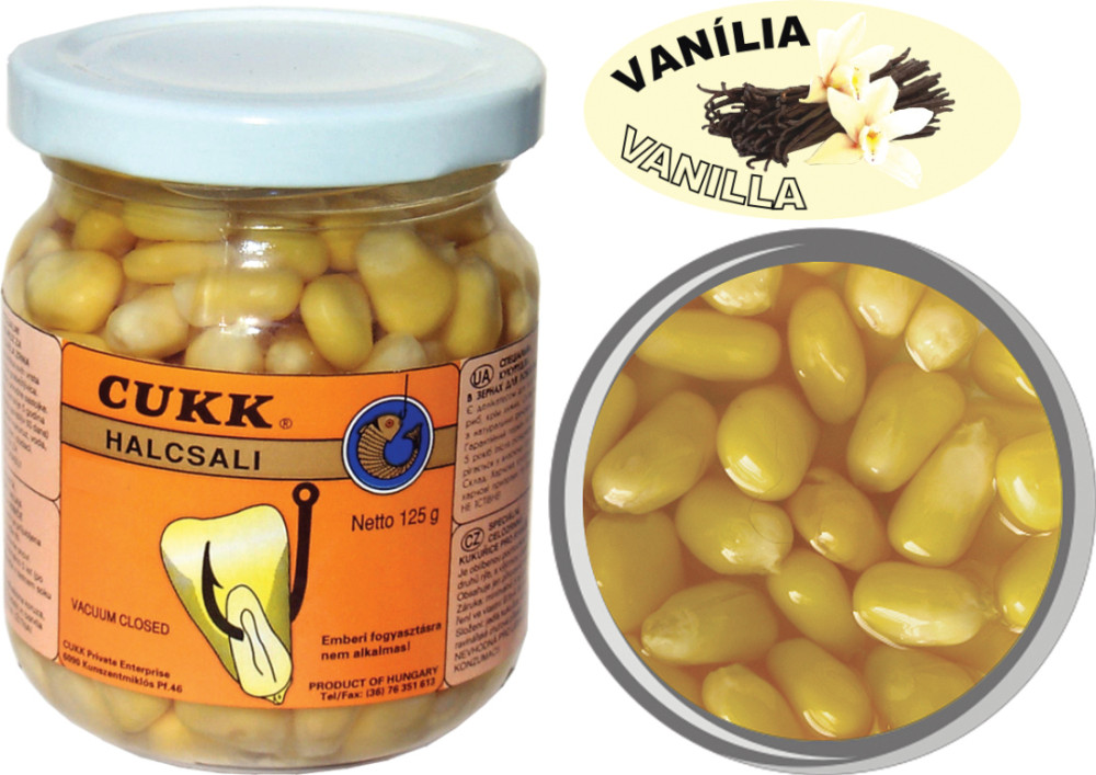 Lúpané a zavárané kukuričné zrná v náleve, príchuť Vanilkal,farba žltá, balenie 125g, univerzálna nástraha na lov kaprov a kaprovitých rýb a inej bielej ryby,nastražuje sa priamo na háčik,alebo , ako boilies, vhodná na feeder, plávanú a lov na ťažko.