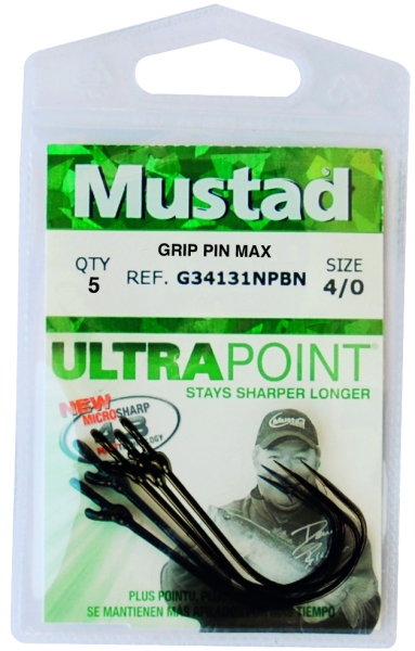 Kvalitné háčiky Mustad UltraPoint GRIP-PIN Ofsett, sú pevné, ostré háčiky s držiakom na ramienku proti padaniu mäkkých gumených nástrah. Určené na lov veľkých dravých rýb Drop Shot metódou. Farba háčika-Black Nickel.