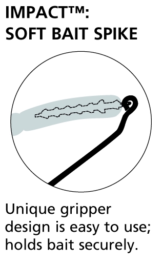 Softbait hook including Impact soft bait spike, unique gripper design, easy to use, holds bait securely.
