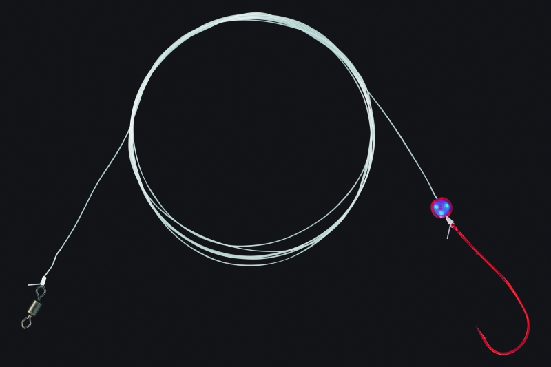tied on 10 lb Seaguar® Fluorocarbon leader with holographic bead and size 14 Mustad rolling swivel. To be fished with nightcrawlers.