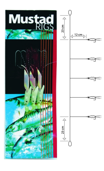 Pilkrový morský nadväzec Mustad je klasický s piatimi nástrahami - ráčikmi na zlatých háčikoch, sú určené na lov morských rýb pilkrovaním z član. Hlavný vlasec má dĺžku - 138cm, bočné nadväzce majú dĺžku – 12cm.