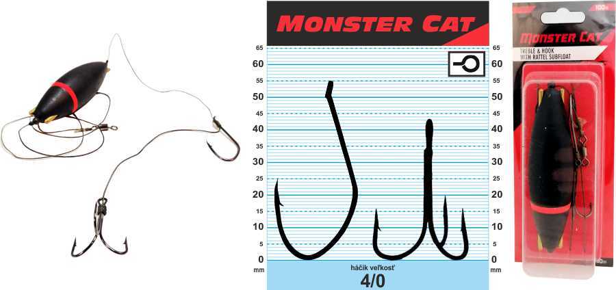 Predpripravený nadväzec na sumca s podvodným plavákom a pevným trojhákom a jednohákom. Naviazaný na extrémne odolnej šnúre s nosnosťou 100kg. Vhodné na lov na rybky. Hrkálka umiestnená v plaváku dráždi sumce k záberu.
