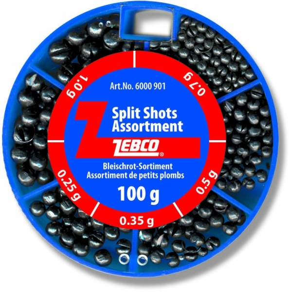 olovené broky zebco Lead Shot-Assorted,okrúhle olovené,sekané broky,plastový zásobník s otočným viečkom,veľkosť od 0,25 g do 1,0 g,celková váha 100 g.