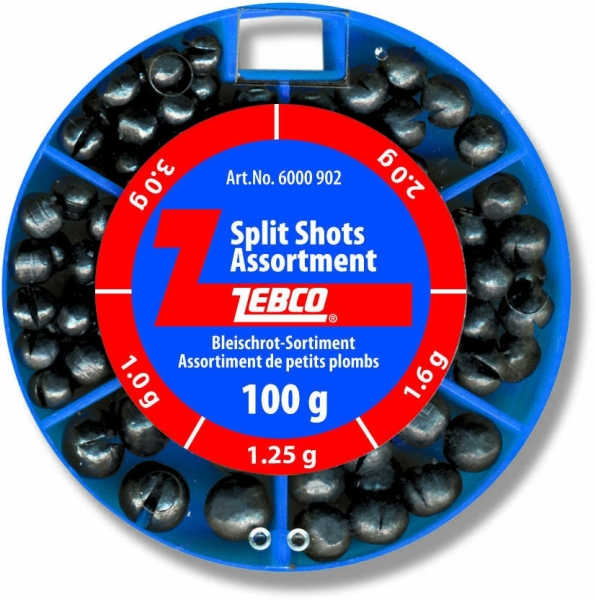 olovené broky zebco Lead Shot-Assorted,okrúhle olovené,sekané broky,plastový zásobník s otočným viečkom,veľkosť od 1,0 g do 3,0 g,celková váha 100 g.