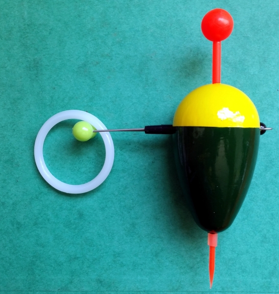 Plavák na lov dravcov systémom na trhačku. Krúžok sa priviaže o bóju, kameň na brehu alebo konár. Plavák sa jednoduchým systémom upevní o krúžok a môžeme chytať