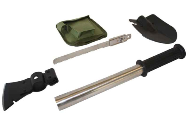 Kempingový alebo rybársky SPORTS set ktorý obsahuje šesť užitočných nástrojov: Rýľ, pílka, sekera, kladivo, otvarák na konzervy a vyťahovač klincov. Jednoduchým stlačením gombíka rýchlo vymeníte požadovaný nástroj. Pevná rúčka je krytá pevnou gumou vďaka čomu perfektne tlmí nárazy pri kopaní, sekaní alebo udieraní kladivom. Všetko náčinie je zbalené v praktickej brašni ktorú si jednoducho nasadíte na opasok a všetko potrebné náčinie máte hneď po ruke.