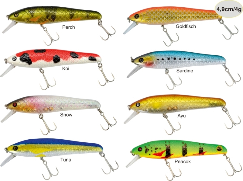 Nové ,realisticky a pohybovo dokonalé voblery.Svojim tvarom sa verne približujú najčastejšie loveným druhom drobných rýb,ktoré tvoria zložku potravy dravcov.Jemný ,kývavý pohyb,minimálny odpor pri tahaní,a osem farebných prevedení tvoria excelentnú ponuku,ktorá uspokojí potreby lovcov na povrchovú,hlbkovú i trollingovú prívlač.