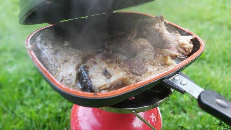 Výborná panvica na ryby, na ktorej pripravíte svoje obľúbené jedlo priamo pri vode. Veľkou výhodou je obojstranné prevedenie, panvicu môžete počas prípravy ľubovoľne otáčať a jedlo nevypadne. Rozmery panvice: 32x25cm
