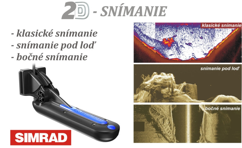 Ak všetky snímania v jednej sonde tak určite nová SIMRAD TotalScan sonda, ktorá má 4 snímania v jednom: CHIRP snímanie 60°, klasické 2D snímanie do 120°, DSI snímanie do 55° a priestorové snímanie do 180°.
