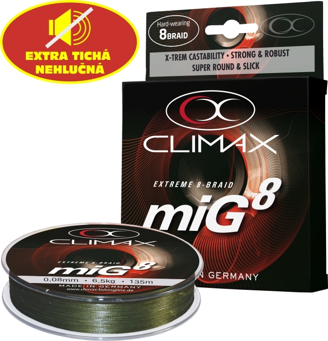 Šnúra miG8 patrí medzi najtichšie prívlačové šnúry na trhu. Má extra jemný povrch, ktorý zaručuje jej tichosť, je super pevná, odolná voči opotrebeniu a oderu, tiež má ochranu voči UV žiareniu. Climax = nemecká kvalita!