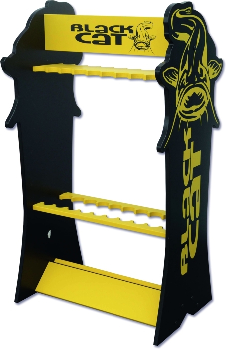 Štýlový stojan s veľkým logom Black Cat pre uskladnenie alebo vystavenie sumčiarských prútov.