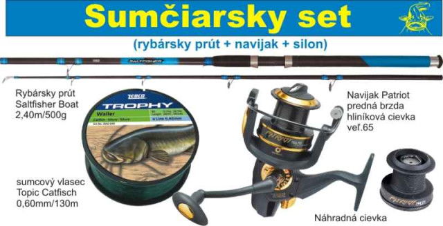 Akciový Sumčiarsky set obsahuje udicu 2,4m Saltfisher Boat H 500g + navijak Patriot FD 765 + náhradná cievka + silon Topic Catfish 0,60mm/130m