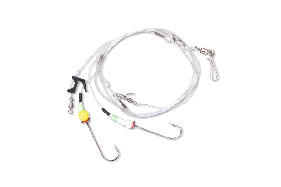 Hotový koncový systém bez záťaže s dvomi jednohákmi s dlhým ramienkom veľkosti 1/0, s korálkami, ideálny pre lov z brehu aj člna na živé nástrahy. Hlavný vlasec 0,7mm, nadväzce 0,4mm. S klipom.