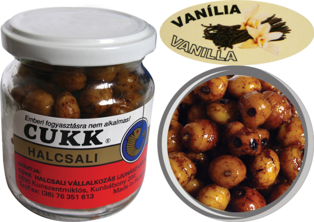 Zaváraný tigrí orech v náleve, príchuť Vanilka, farba hnedá, balenie 125 g, výborná nástraha na lov kaprov, amurov, karasov a veľkej bielej ryby, napichuje sa priamo na háčik, alebo sa nastražuje vlasovou metódou, ako boilies.