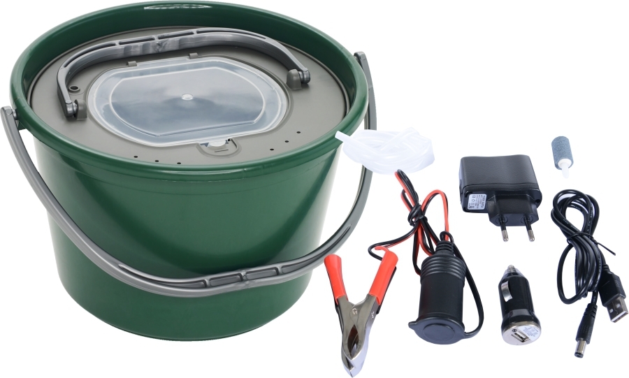 Okysličovač napájaný na 230V, 12V akumulátorom, AA batériami alebo cez USB spolu s vedrom na živú nástrahu za výhodnú cenu