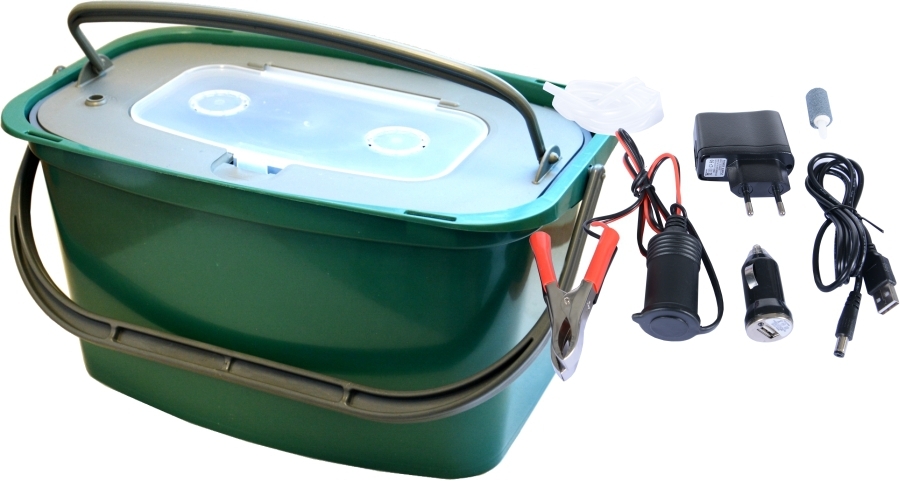 Set v ktorom nájdete okysličovač vody na AA batérie, napájanie 230V alebo USB spolu s vedrom (7L) na prechovávanie živých rybiek. S úchytom na okysličovač.
