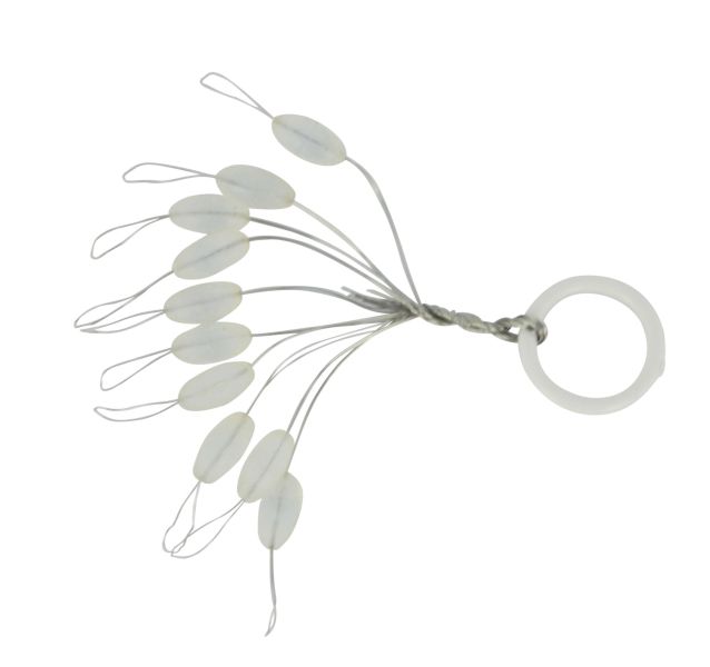 Sumčiarske silikónové zarážky oválneho tvaru slúžiace pre nastavenie a zaistenie plavákov alebo ochranu uzlov. Pre jednoduché natiahnutie na vlasec alebo šnúru sú navlečené na drôtikoch s očkom.